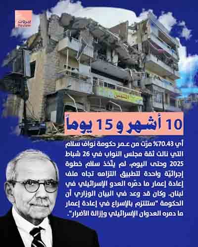 10 أشهر و 15 يوماً مرّت على ولادة حكومة نوّاف سلام، ووعوده لا تزال حبرًا على ورق. فبيان الحكومة الوزاري الذي ألزمها “بالإسراع في إعادة إعمار ما دمره العدوان الإسـرائيلي وإزالة الأضرار” بقي حتى الآن بلا تنفيذ، بل حتى دون بوادر للبدء بالخطوات الأولى باتجاه الإعمار.